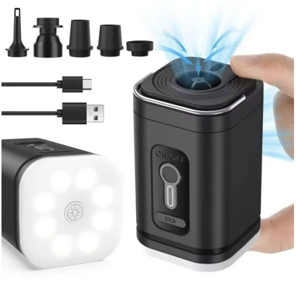 Насос оснащён пятью сменными насадками, что делает его универсальным решением для различных типов клапанов. Работает от USB, не требует розетки, легко заряжается от пауэрбанка, ноутбука или адаптера.